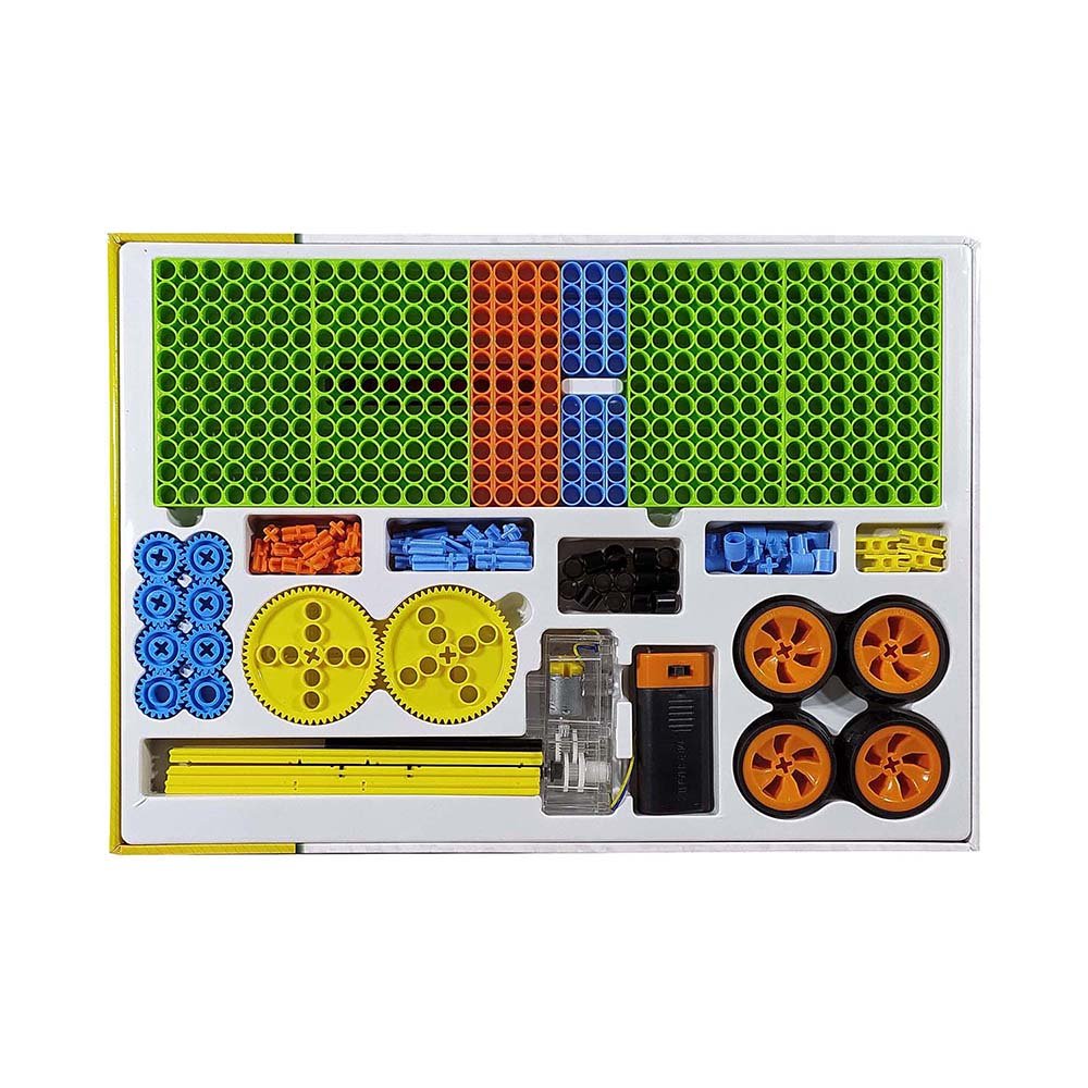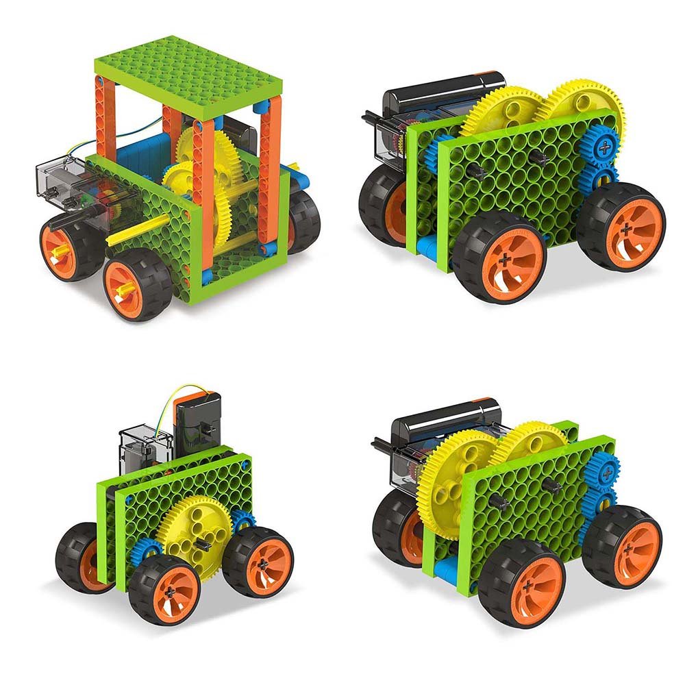 This kit comes with all the tools, and parts to build 10 different experiments, one at a time. After completing these 10 experiments, the builder can use the connectors, beams, motor and the gears to create many more models and projects.