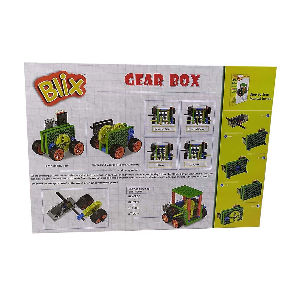 This unique BLIX set allows you to perform 10 different experiments where you can learn about the different uses of gears with motorised models. Finally you can build a car where you can change gears between Reverse-Neutral-First-Second.