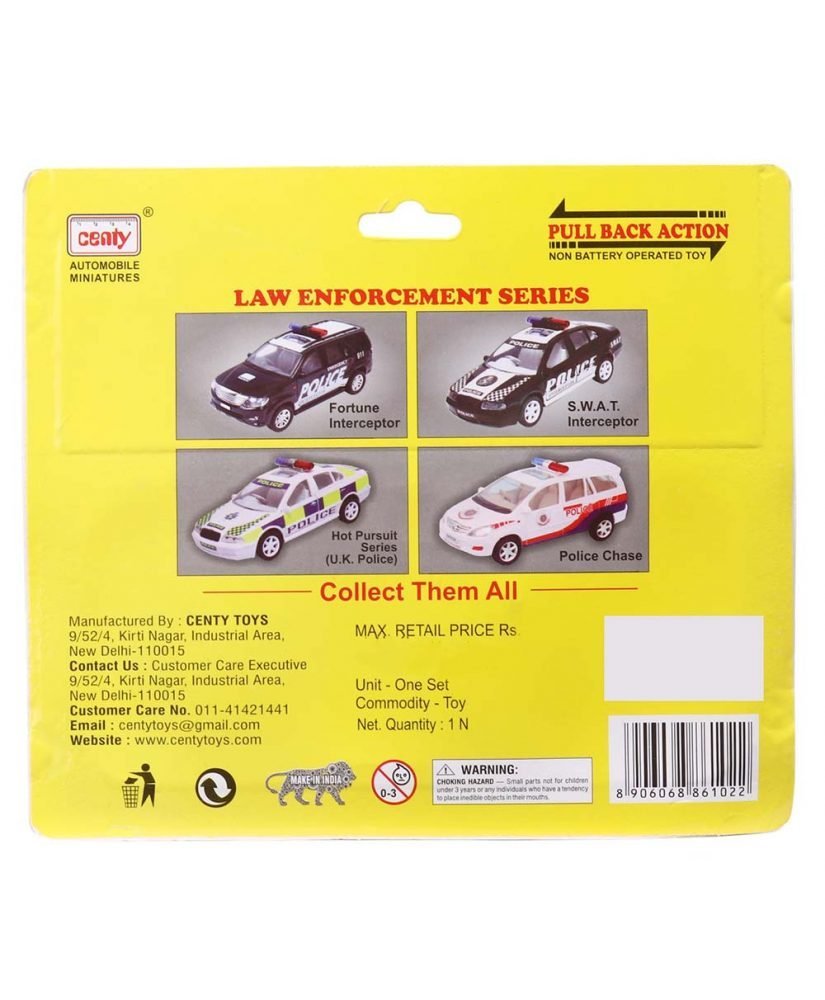 Buy your kid this amazing miniature of Centy Fortune Police Interceptor with pull back action. It will Keep your kid entertained for hours. It features a pull back and swivelling action for extra fun. It helps them better their motor skills, eye- hand coordination, and the sensibilities of colors and shapes.